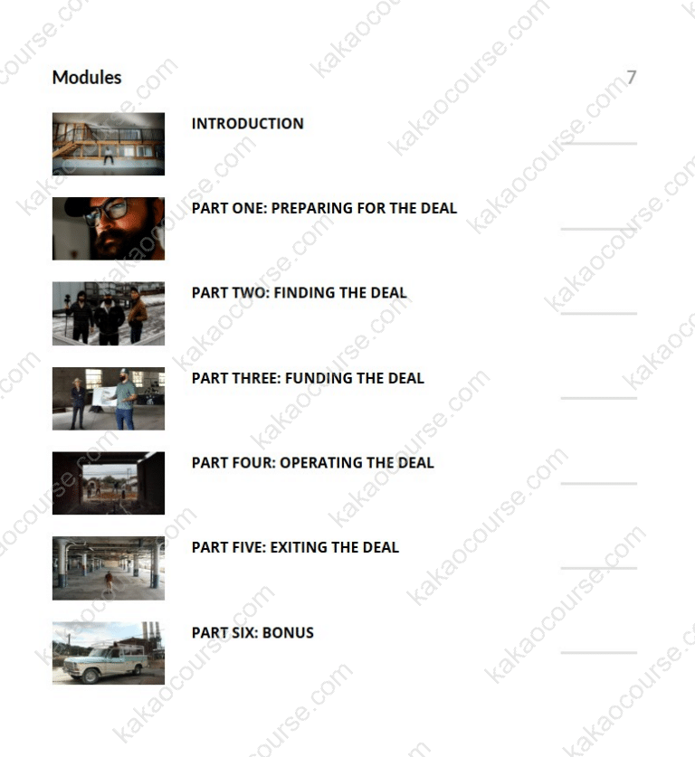 Across 6 modules, 80+ lessons, and 17+ hours of video, you’ll walk step-by-step from education to execution. You’ll also get 20+ downloadable tools (underwriting spreadsheets, sample leases, checklists, calculators), 5 expert interviews, and ongoing behind-the-scenes updates—so your playbook grows as the market evolves.